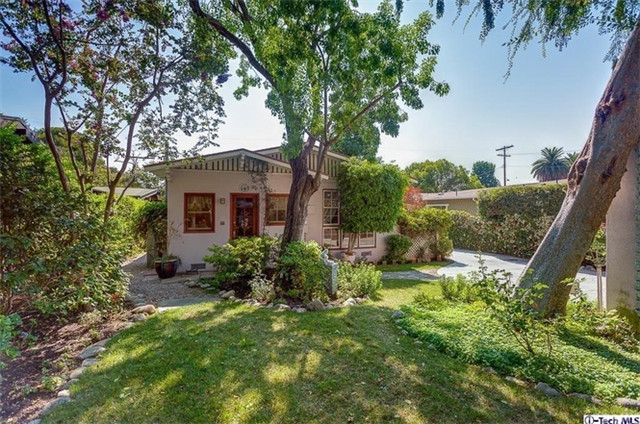 为您介绍的是坐落在洛杉矶帕萨迪那Pasadena的单层独栋别墅,别墅周边风景优美,绿化面积充足,坐落于林木之间,庭院有着大片修剪整齐的草坪和种植的花朵。