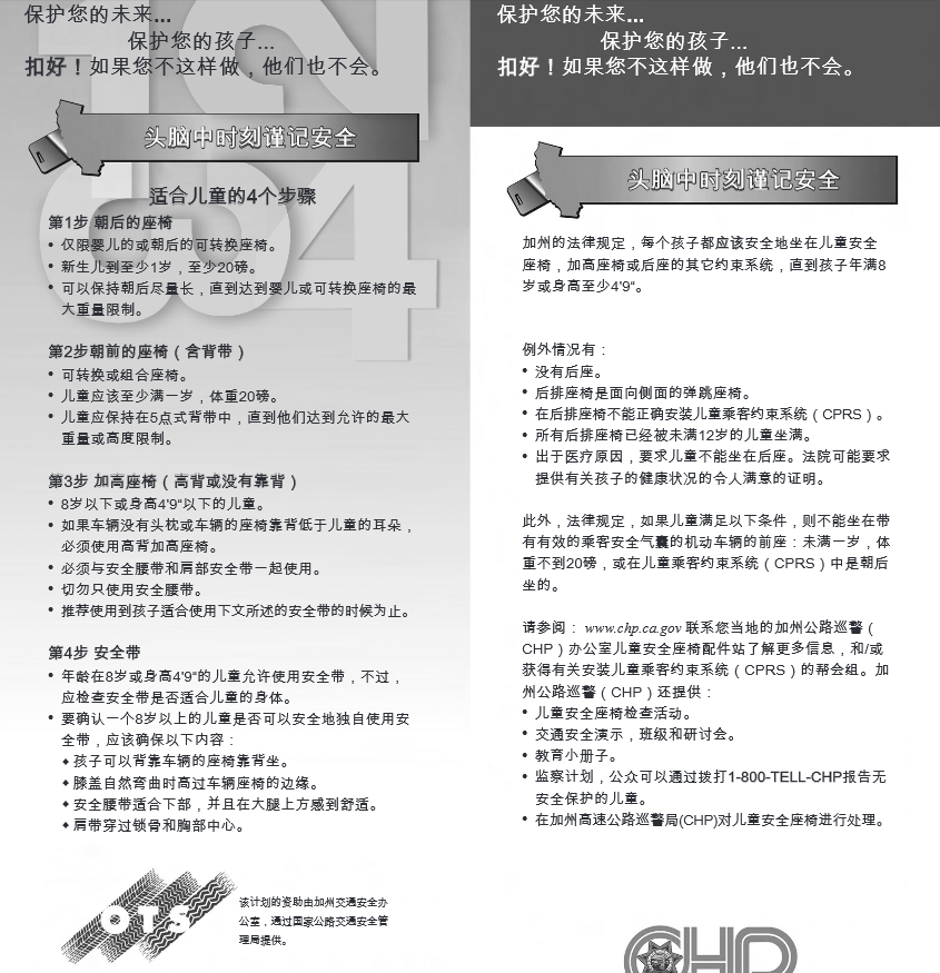 特别是在2014年加州新交规中有所规定,家有幼童的家长要特别注意汽车安全座椅的规定有所改变。若家中使用的是「低扣环和栓带系统」(Lower Anchors and Tethers for Children,LATCH),儿童和安全座椅的总重量不得超过65磅,超过重量的话必须使用车上安全带。