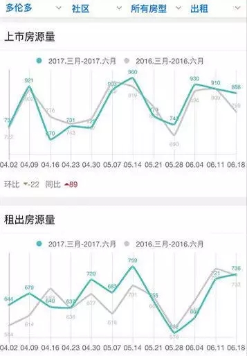 再看多伦多出租房源在市场上的平均待市时间,4.30号以后,房源租出去的速度变快,待市时间(蓝线)不断减少,比去年同期(灰线)少了一截。也是一定程度上反应了租房市场的升温。