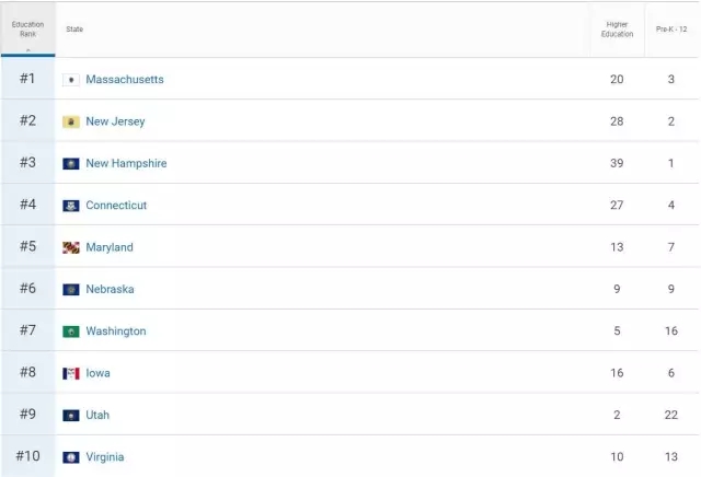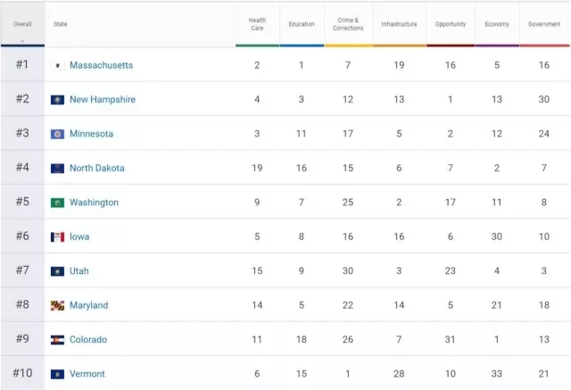 综排前十的各州分别为:马萨诸塞州、新罕布什尔州、明尼苏达州、北达科他州、华盛顿州、爱荷华州、犹他州、马里兰州、科罗拉多州和佛蒙特州。而华人生活比较集中的纽约州、加州分别排在17和23名。下面小编带大家一起看看几个你们最关心的指标吧。