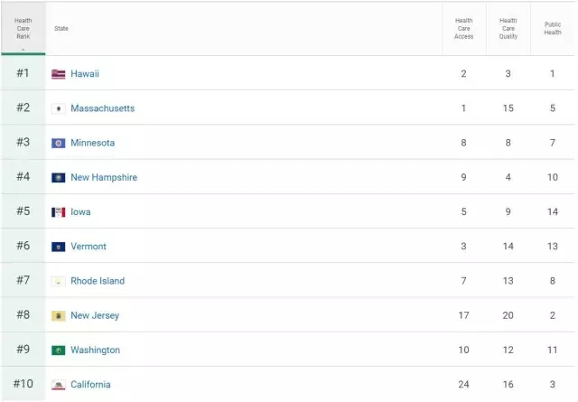 在评估医疗保健这个指标的时候,预防性医疗和牙科治疗是一个重要考虑因素。自从2010年奥巴马医改 (Obamacare) 通过以来,没有医疗保险的比例已经达到历史新低,低于10%。这一措施自实施以来备受争议,因为美国人对待“生老病死”这件事很严肃,这也使得医疗保健福利这个类别在整个排名中承担了最大分量。马萨诸塞州成为医疗保健最佳的州,夏威夷位居第二位。其他排名前十的,有一些面积很小州,其中包括新罕布什尔州,佛蒙特州和罗德岛。