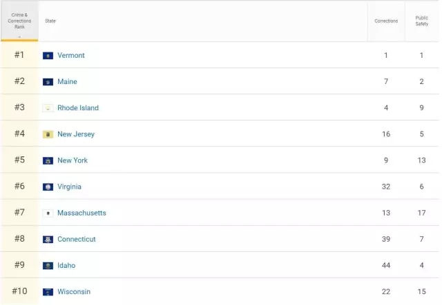 这几年美国的犯罪率已达到历史低点。纽约大学报道说:“今天普通人在大城市街上比以往30年的任何时候都要安全。”由于监狱改革,现在美国各州和联邦监狱的人口正在慢慢减少。因为对犯罪事件有力的处理和惩罚措施,新英格兰地区一些小州在评选中脱颖而出。佛蒙特州在社会治安方面排名第一,缅因州位居第二,罗得岛位列第三。另外,人口庞大的新泽西州和纽约州也排进了前十名。