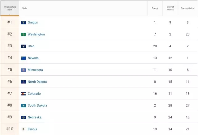 虽然美国是教育、创业和生活质量最好的国家之一,但它在基础设施方面其实很落后。在2013年美国土木工程协会的报告中,美国只获得了D+的评分。特朗普选前承诺将投资1万亿美元来重建美国道路、桥梁、港口和其他公共设施。太平洋西北部的俄勒冈州和华盛顿州位列基础设施排行的前两名,这两个州拥有着全美最好的交通、能源和互联网设施。另外,前十名也由西部和中西部州包揽:犹他州、内华达州、科罗拉多州、北达科他州、南达科他州、明尼苏达州和伊利诺伊州。
