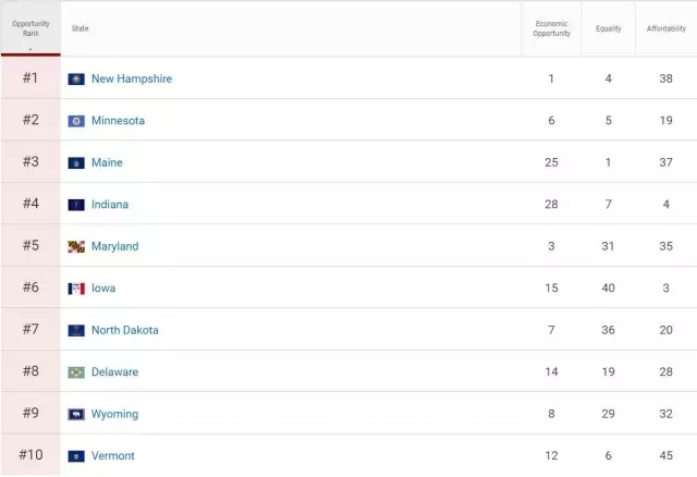 美国立国200多年来,自由成为政治正确的第一话语,也是每个人的核心价值观所在。20世纪60年代,一场声势浩大的平权运动在全美展开,美国国会于1964年通过了《公民权利法》,并在此基础上制定一系列被统称为“肯定性行动”的法律,保障了少数族裔和弱势群体在招工、入学、企业竞争中免受不公正的待遇。全美家庭收入最高的新罕布什尔州位列发展机遇排行榜的第一位,明尼苏达州排名第二,缅因州排名第三。