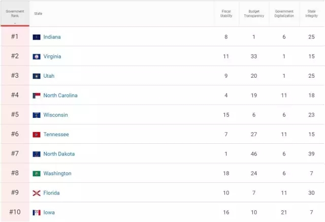 政府管理能力在现代社会已经变得越来越重要,由于政府有效的管理和制定正确的政策,美国一些州的经济水平已经达到了和其他国家势均力敌的水平。比如,加州经济体量超越法国,成世界第六大经济体。印第安纳州位列此项排名的第一名,弗吉尼亚州和犹他州分列二、三名。