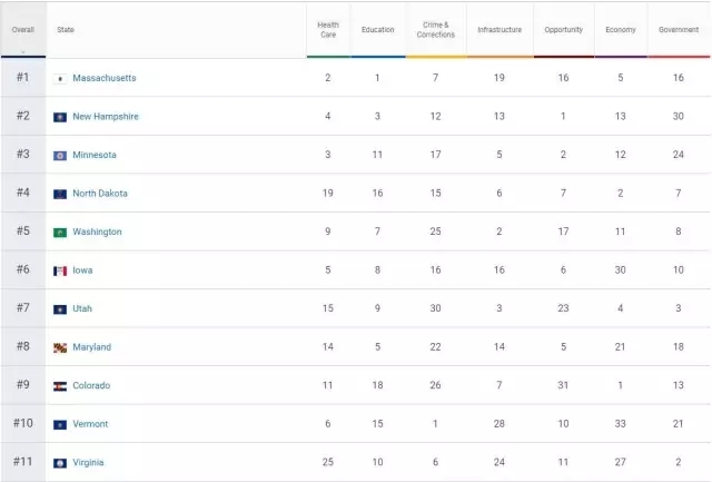 《美国新闻与世界报道》(U.S. News & World Report)最新出具的权威报告从医疗保健、教育水平、社会治安、基础设施、发展机遇、经济水准、政府管理能力等多个维度分析了各州实力,看过之后你就明白,哪些州的居民真的可以安居乐业,享受到更好的教育、医疗等福利,并且受益于本州强劲经济发展势头。无论你关心的侧重点是哪里,都能给你提供参考。