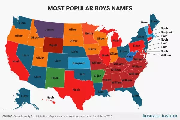 而在东南部地区以及东部的阿巴拉契亚地区(南至密西西比州和阿拉巴马州边界,北至宾夕凡尼亚州和纽约州,也包括部分的乔治亚州、南卡罗来纳州、北卡罗莱纳州、田纳西州、弗吉尼亚州、肯塔基州、俄亥俄州、马里兰州以及整个西弗吉尼),男孩儿叫威廉更为普遍。