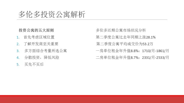 最后一部分,Eva 讲解了投资公寓的五大原则:首先考虑区域位置、了解开发商、多方面综合考量、分散投资降低风险、买先不买后。在多伦多,比较火热的公寓投资地理位置是哪些、多伦多和温哥华公寓从增加15%的外国人购买房产附加税之后的行情如何、现在购买公寓,支付首付之后,是否能做到以房养房,这些内容Eva都在昨天的线上讲座中进行了讲解。