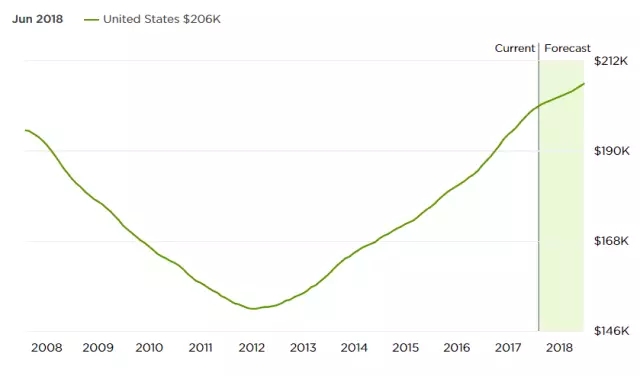 美国次贷危机爆发十年之后,当地房价重返巅峰时期水平。近日,美国房产信息网站Zillow(NASDAQ:Z)发布6月房地产市场报告,显示全美房价总价的中位数达到20.04万美元(约合人民币133.5万元),同比上涨7.5%。这是美国房价中位数历史上首次突破20万美元。此前,即使在2007年房地产泡沫高峰期,该数字最高只达到19.66万美元。