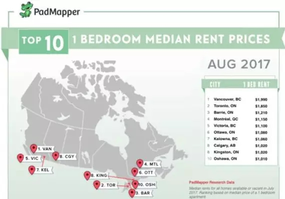 最近,Padmapper发布了一份租金月度调查报告,显示加拿大十个租金最高的城市,一居室的平均租金全部在$1,000以上。