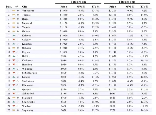 第11~14名分别是里贾纳、哈利法克斯、Kitchener、哈密尔顿,也分别达到了$1000、$990、$980、$950,上涨到$1000/月也只是时间问题。
