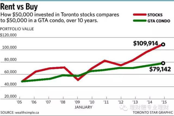 这是在投资选择上的一种可能性。因为理论上,当有其它投资产品可以取代房地产的时候,对房地产的需求量就会大幅度下降。比如下图,是一个对比在大多地区买公寓和放在股市里面在过去10年所获得回报的差别。