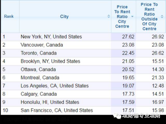1. “居住需求”的购房者不会因为有其它投资暂时比买房回报高,就果断选择放弃购房的,他们还需要考虑放弃购房的代价,比如租金的影响。衡量这一代价的一个重要参数是房价/租金比,它可能成为人们买房的驱动因素之一。这个数字越大,越代表租金相对于房价较为便宜,人们越容易选择租房而不是买房。为此我上网查了一下北美各大城市的房价/租金比,并作出了下图。
