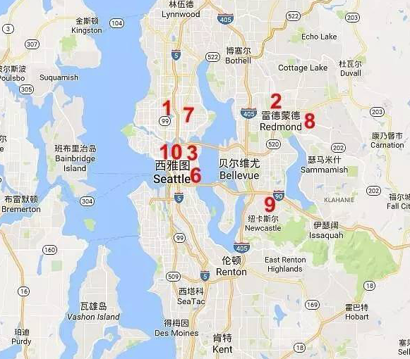 大西雅图地区这十大私立学校,有六所在西雅图市,两所在东部的雷德蒙德Redmond市,两所在南部的塔科马Tacoma市。首先看看这些学校在大西雅图地区的分布情况: