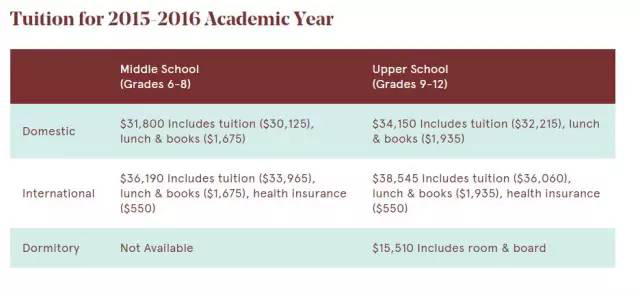 学费:9-12年级 $30,700/年; 6-8年级 $ $29,700/年