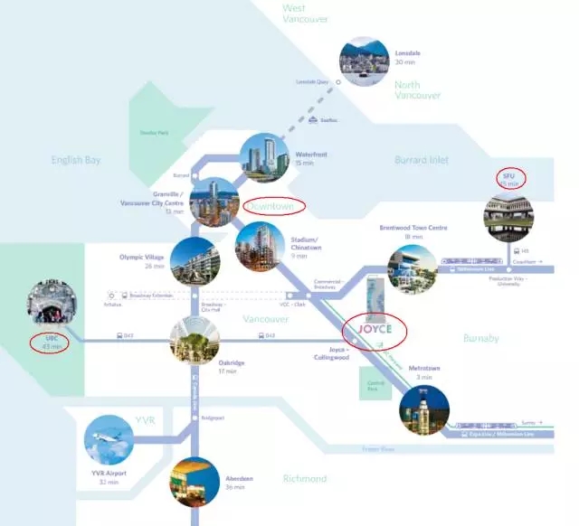 温哥华市区地理位置优越,北部是温哥华市中心,西边有UBC大学、东边是SFU大学,三条skytrain贯穿其间。