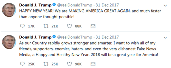 特朗普还在推特上发文说:“随着我们的国家越来越强大,越来越聪明,我希望所有的朋友、支持者、敌人、仇敌,甚至不诚实的假新闻媒体都有个健康、快乐的新年。2018年将是美国变得伟大的一年。”