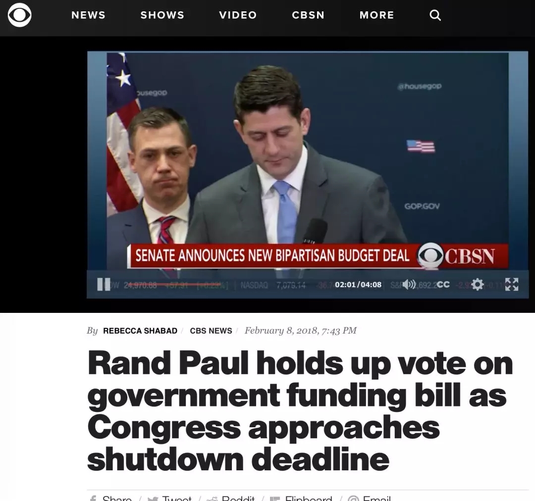 晚上参议院对于预算案的投票上,共和党参议员Rand Paul,因为反对提高预算,利用投票规则,阻碍了快速投票流程,致使零点之前,参议院无法通过预算案: