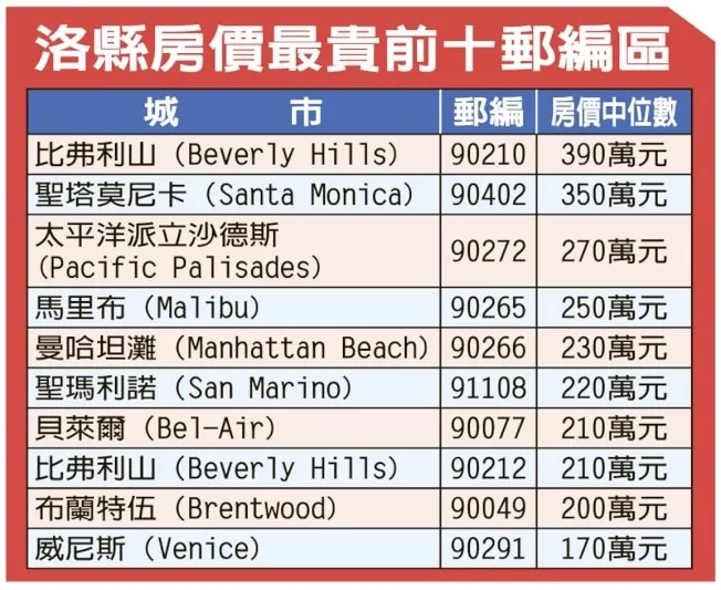 在地产网站PropertyShark所做的2017年全美100个最贵邮编区号地区中,有77个位于加州,而洛杉矶便占据了18个名额,超越其他各县。